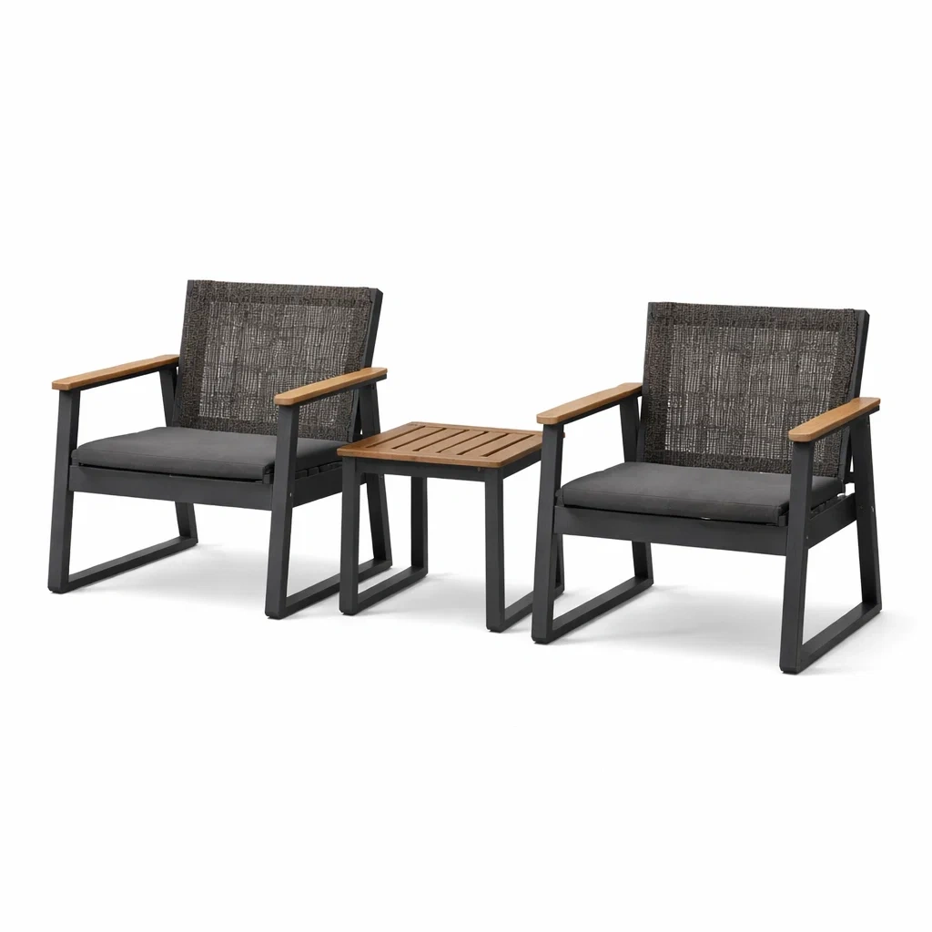 Set da relax piccolo da giardino in acciaio e legno con cuscini grigio