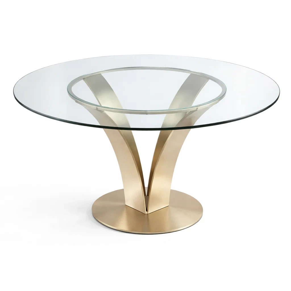 Tavolo da pranzo rotondo in vetro temperato e metallo placcato oro
